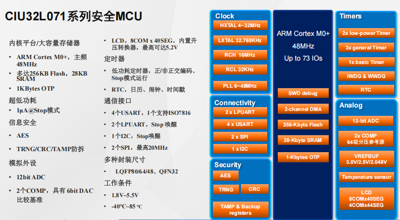 产片介绍:内核平台 大容量存储器·ARM Cortex M0+,主频48MHz多达256KB FIash,28KB SRAM1KBytes OTP超低功耗1uA@Stop模式 信息安全·AES TRNG CRC TAMP防拆 模拟外设 12bitADC 2个COMP,具有6bitDAC 比较基准 LCD,8COMx40SEG,内置升压转换器,最高可达5 2V 定时器 低功耗定时器,正 非正交编码、 Stop模式运行 · RTC,日历、闹钟