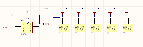 12V供电、主控、五个RGB幻彩灯 、一个按键 。