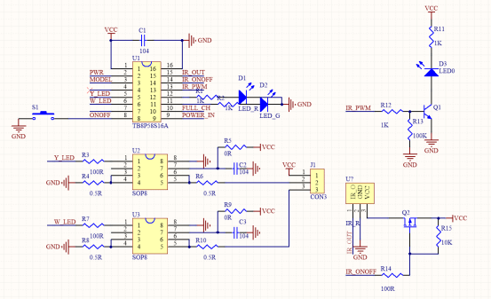 此款是由IR发射接收电路,指示灯、恒流控制功能组成的产品方案,主控芯片采用TB8P58S16A系列芯片,SOP封装型号是16引脚,该芯片2Kx14 位的程序存储器空间,内建高精度十一加一通道 12 位ADC模数转换器,与高精度电压比较器,足以应付各种模拟接口的侦测与量测,有四组定时器,可用系统时钟当作一般的计时应用或者从外部讯号触发来计数。另外它提供 4 组 10 位的 PWM 输出,3 组蜂鸣器输出,可用来驱动马达、LED、或蜂鸣器等,可选择多种工作模式如正常模式(Normal)、慢速模式(Slow mode)、待机模式(Standby mode)与睡 眠模式(Halt mode),可节省电力消耗,延长电池寿命。通过精心设计的电路,可以实现如下功能: