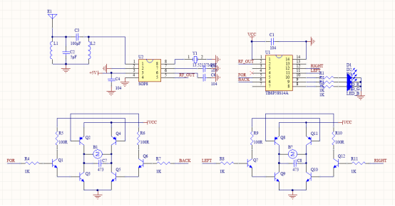 遥控接收电路收到发射端的信号后解码,根据指令对马达进行前进,后退,加速,向左,向右的控制。