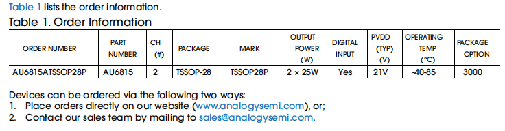 AU6815 支持 TSSOP-28 封装,无需散热片,其额定温度范围为 –40°C 至 +85°C。有关订购信息,请参见表 1。
