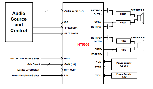 产片介绍:HT5606是一颗I2S输入的立体声D类音频功放支持多种采样频率,包含两种速率模式。HT5606除了驱动BTL立体声双喇叭外,还能驱动PBTL单喇叭。HT5606包含了硬件工作模式和I2C控制模式,具有数字限幅器、AGC、多种增益选择,支持不同应用下较宽的工作电压范围