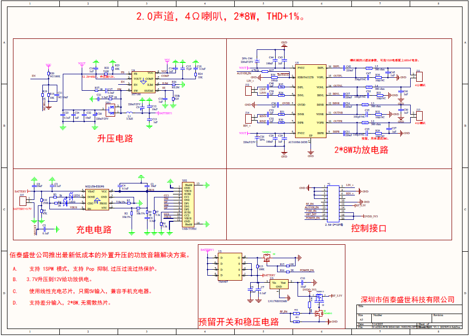 产片介绍:方案功能:双节锂电池(配置NS2585充电芯片,2A充电电流)可选单节锂电池(配置NS2159充电芯片,1A充电电流)外置升压芯片(配置HT7180芯片,10A峰值电流,最高升压值12 6V)模拟功放芯片(配置AU3108芯片,供电8V-14V,最高功率2*15W