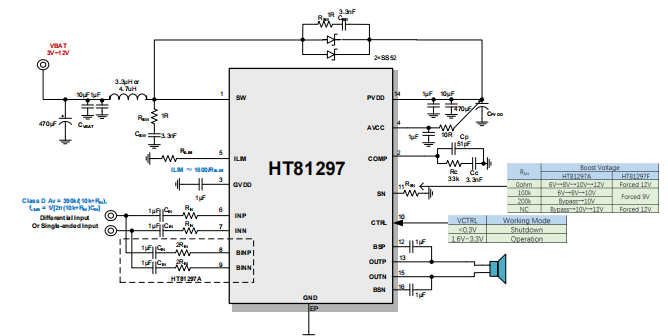 HT81297F则内置固定升压,提供一个固定9V或12V的升压给D类功放。HT81297可配置升压限流值,以防止过大的电流尖峰。HT81297具有先进的扩频功能来抑制EMI。HT81297的增益为32dB。此外,HT81297集成了输出端过流保护、片内过温保护、升压过压保护等功能。