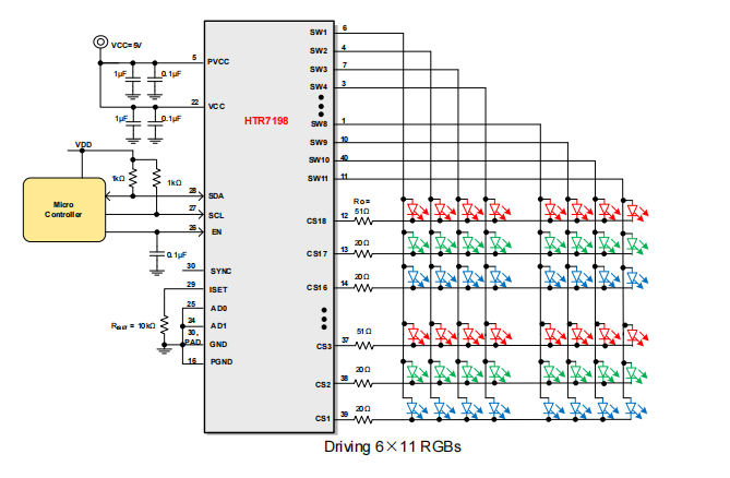 本系列产品是一款通过1MHz的I2C接口(HTR7198,HTR7144)或 10MHz SPI 接 口(HTR7198S,HTR7144S)进行编程的支持18X11或18X8阵列的LED驱动芯片,每路SWx都支持8位PWM数据进行独立调光,并且每路CSx都有8位的直流扫描数据用来支持每个点的256阶的线性PWM调光,并且每个CSx都支持256阶的直流电流可调节等级。