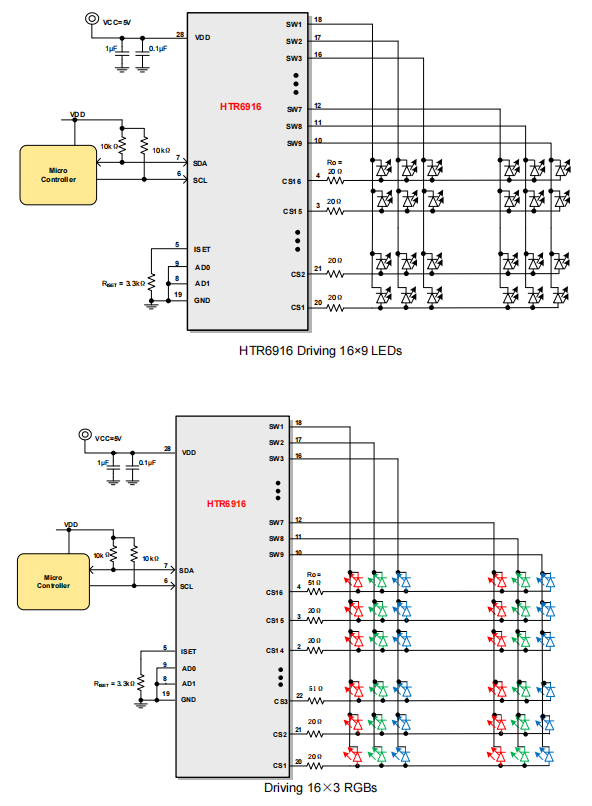 HTR6916是一款通过2线串行接口进行编程的支持16X9阵列的LED驱动芯片,每个LED都支持8位PWM数据进行独立调光。此外,可以通过ISET端的外部电阻设置全局电流。