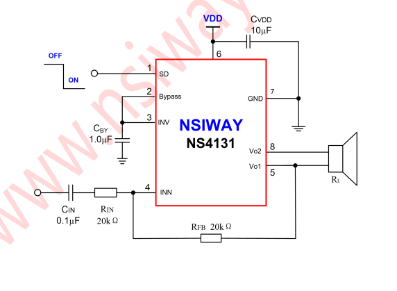NS4131是一款AB类桥式输出音频功率放大器。其应用电路简单,只需极少数外围器件。输出不需要外接耦合电容或上举电容和缓冲网络,更适合用于便携系统。