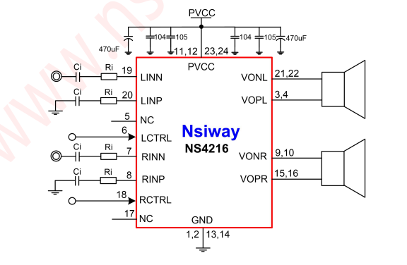 产片介绍:NS4216 是一款差分输入,超低 EMI,无需滤波器,20W(10W×2)双声道 D 类音频功率放大器。芯片有两个控制端分别控制芯片的左右声道,可通过高低电平控制芯片的工作模式:LCTRL RCTRL脚电压为高电平时,芯片的 L R 通道进入工作模式,低电平时芯片关断,应用灵活方便。