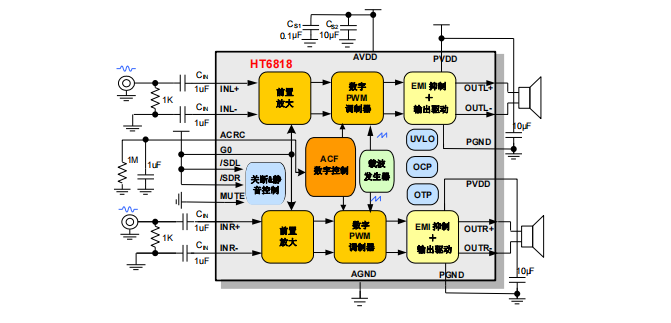 HT6818的防削顶失真功能可检测并抑制由于音乐、语音信号幅度过大或电池电压下降所引起的输出削顶失真(破音),显著提高音质,创造舒适的听音享受,并保护扬声器免受过载损坏。通过在ACRC端外接不同电阻电容值,可灵活设置放大器的音质和输出功率;同时芯片提供了ACF Off模式。