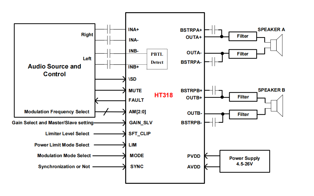 HT318具有丰富的功率限制功能,以满足各类应用。一种是功率限制功能(PCLP),即在输出端限制其最大输出摆幅低于设定值,可避免意外的超额输出功率损坏喇叭。另一种为自动增益控制功能(AGC),开启后,可有效改善因输入幅度过大或者电源电压降低造成的破音失真。