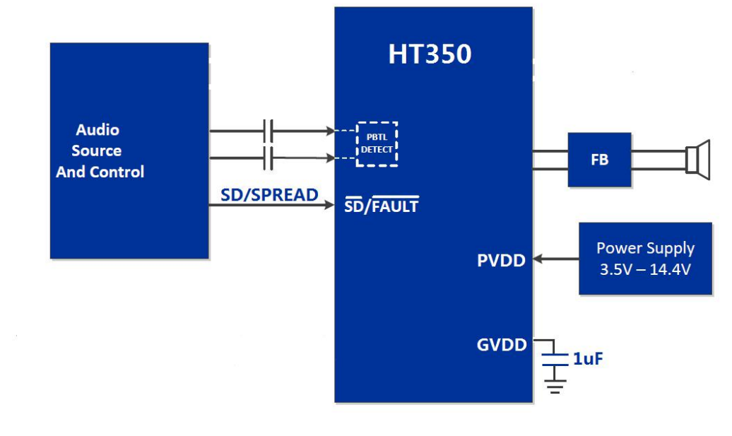 供电的单声道(PBTL)模式下,能够持续提供30W/4Ω