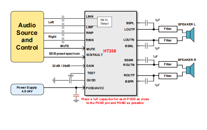 HT338是一款高效D类音频功率放大器。在24V供电的立体声(BTL)、THD+N=10%条件下,能够持续提供2*40W/6Ω功率输出;在单声道(PBTL)、模式、THD+N=10%条件下,能够持续提供100W/3Ω功率输出。