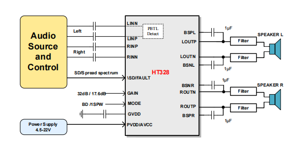 HT328是一款高效D类音频功率放大器。在22V供电的立体声(BTL)模式、THD+N=10%