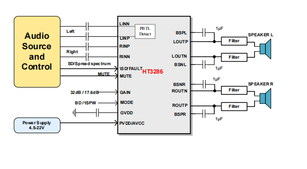 HT3286是一款高效D类音频功率放大器。在22V供电的立体声(BTL)模式、THD+N=10% 条件下,能够持续提供2*33W/8Ω功率输出;在 单声道(PBTL)、模式、THD+N=1%条件下, 能够持续提供50W/4Ω功率输出。