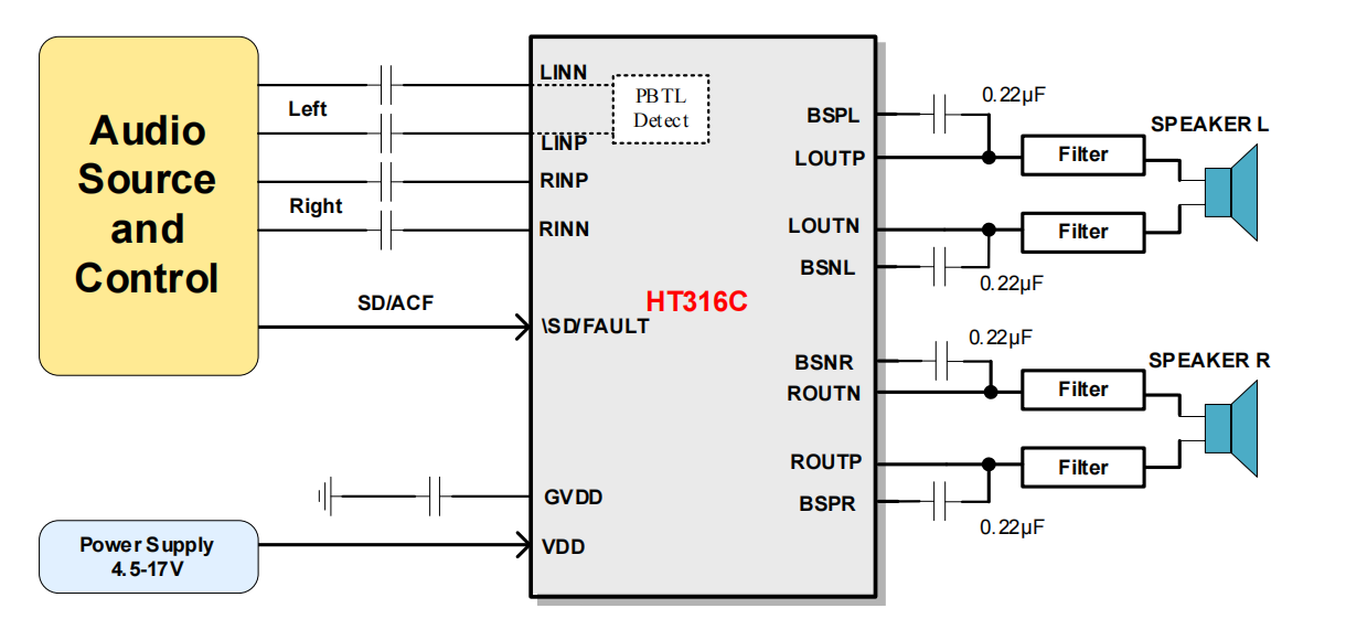 HT316C是一款高效D类音频功率放大器。在14V供电的立体声(BTL)模式、THD+N=10%条件下,能够持续提供2*20W/4Ω功率输出;在单声道(PBTL)、模式、THD+N=10%条件下,能够持续提供34W/4Ω功率输出。