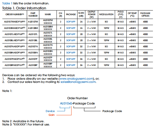 产片介绍: AU3107 AU3108 是一款 10W 每通道、高效率、低静态电流 D 类立体声音频放大器。它可以驱动负载低至 3 2Ω 的立体声扬声器。其中,AU3107 工作在 BD 模式下,可以获得更好 THD+N 性能AU3108 支持 1SPW 模式,可 以获得更好的热性能。AU3107 AU3108 工作电压范围为 8V-14 5V。
