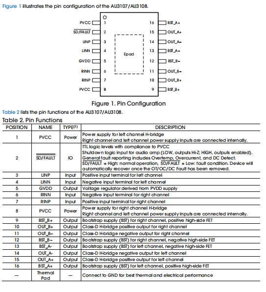 AU3107/AU3108 是一款 10W 每通道、高效率、低静态电流 D 类立体声音频放大器。它可以驱动负载低至 3.2Ω 的立体声扬声器。其中,AU3107 工作在 BD 模式下,可以获得更好 THD+N 性能AU3108 支持 1SPW 模式,可 以获得更好的热性能。AU3107/AU3108 工作电压范围为 8V-14.5V。