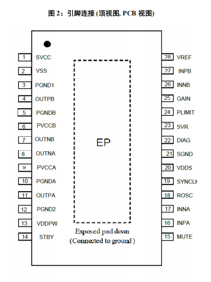 产片介绍:描述 SMH7492PE是一款为家庭音频应用设计的双桥接BTL类D音频放大器,采用单电源供电。特性⚫ 宽范围单电源操作(7 - 26 V)⚫ 可能的输出配置:- 2 x PBTL- 1 x 并行BTL⚫ BTL 输出能