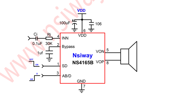 NS4165B 在 5V 的工作电压时,能够向 2Ω负载提供高达 5.4W 的输出功率。