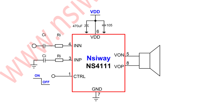产片介绍:NS4111 是一款 10W 单声道 AB D 类切换音频功率放大器,支持差分输入,超低 EMI,无需滤波器。可通过不同电平控制芯片的工作模式:CTRL 脚电压为 2 0V-5 0V,芯片进入 D 类工作模式,0 9-1 5V 时芯片进入 AB 类工作模式,0 4V 以下时芯片关断,应用灵活方便。