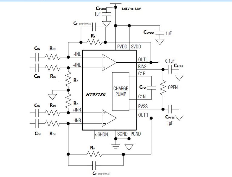 器件内部集成电荷泵产生负电压,器件输出级由输入正电压和该负电压驱动,使得输出偏置在零电位,省去了大尺寸、容易引入失真的输出耦合电容。