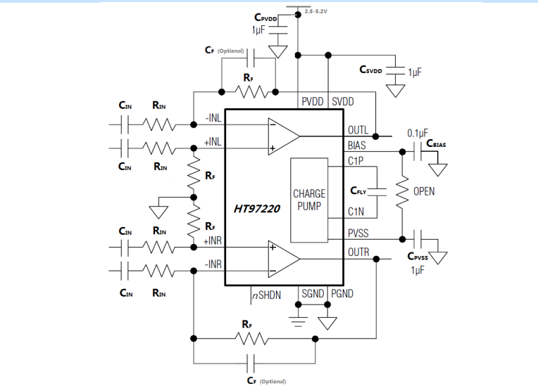 HT97220(L)是一款差分输入/单端输入、可直接输出驱动的耳机放大器/线路驱动器。5V供电时,器件可为32ohm耳机提供125mW的功率。器件可通过外部电阻调节增益 (固定增益6dB版本需要提前定制)。器件在音频范围内具有卓越的THD+N表现。
