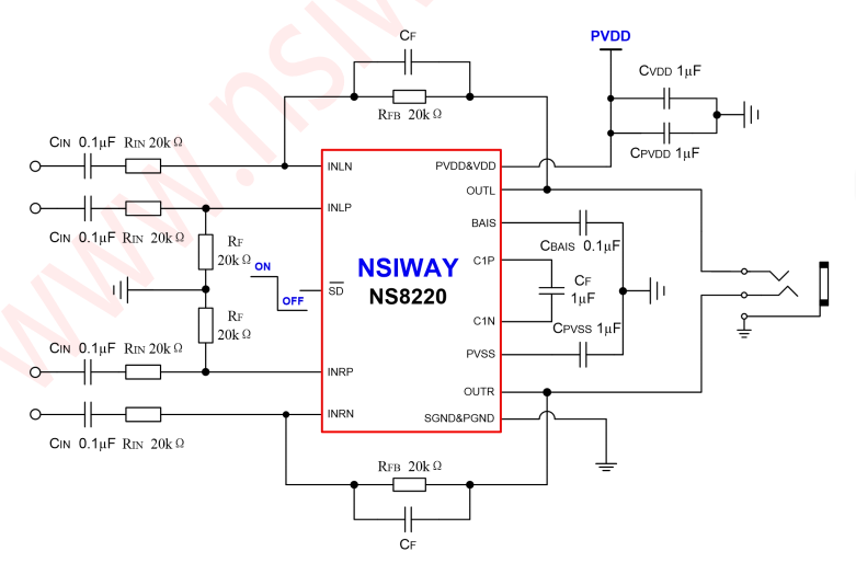 NS8220 是一款差分/单端输入,输出无需隔直电容,能直接输出驱动的耳机放大器。客户可以通过外置输入电阻和反馈电阻灵活设置增益。