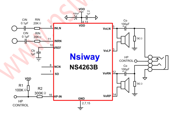 NS4263B 是一款带 AB 类/D 类工作模式切换功能、超低 EMI、无需滤波器、3W 双声道音频功放。另外,当耳机插头接入插孔时,音频功率放大器便以单端工作模式驱动立体声耳机。通过一个控制管脚使芯片在 AB 类或者 D 类工作模式之间切换,以匹配不同的应用环境。即使工作在D类模式NS4263B采用先进的技术,在全带宽范围内极大地降低了EMI 干扰,最大限度地减少对其他部件的影响。为简化音频系统的设计,NS4263B 的桥式连接扬声器放大模式及单端立体耳机放大模式都在同一芯片上实现。NS4263B 无需滤波器的 PWM 调制结构及反馈电阻内置方式减少了部元件、PCB 面积和系统成本。NS4263B 内置过流保护和欠压保护功能,有效地保护芯片在异常工作状况下不被损坏。NS4263B 提供标准的 SOP16 封装。