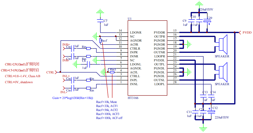 HT3166具有防削顶失真(ACF)输出控制功能,可检测并抑制由于输入音乐、语音信号