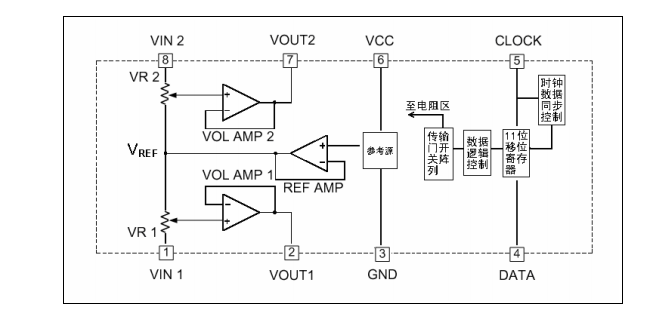 M62429 采用二线制串行数据信号控制,内置参考源电路以减少构成电子音量调节器的外围元件,本产品可与三菱公司的 M62429PIFP 产品完全兼容。