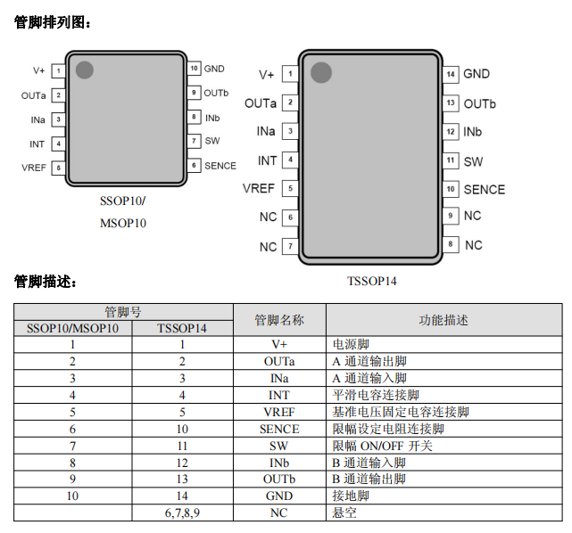 产片介绍:概述: D2761是为保护扬声器所设计的音频限幅器,其限幅值可通过外接电 阻来调节,适合在个人电脑、便携式音响等系统中作音频限幅用。 D2761采用SSOP10、MSOP10、TSSOP14的封装形式封装。 主要