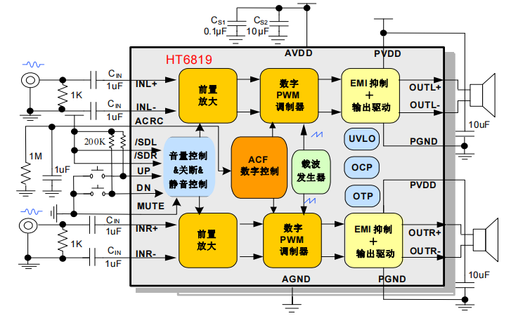 HT6819的防削顶失真功能可检测并抑制由于音乐、语音信号幅度过大或电池电压下降所引起的输出削顶失真(破音),显著提高音质,创造舒适的听音享受,并保护扬声器免受过载损坏。通过在ACRC端外接不同电阻电容值,可灵活设置放大器的音质和输出功率;同时芯片提供了ACF Of模式。